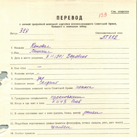 Коновал Михаил, 08.11.1901 г. р., Боровков. Рядовой, пехота. Попал в плен 11.11.1943 г. в Киеве в лагерь 328.