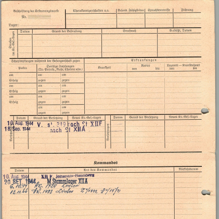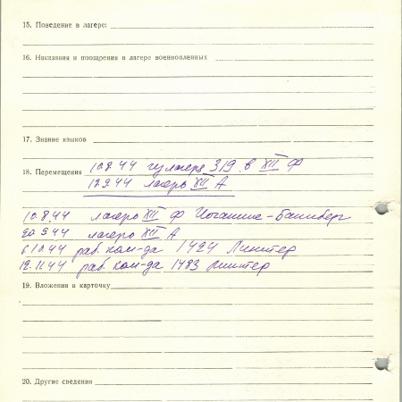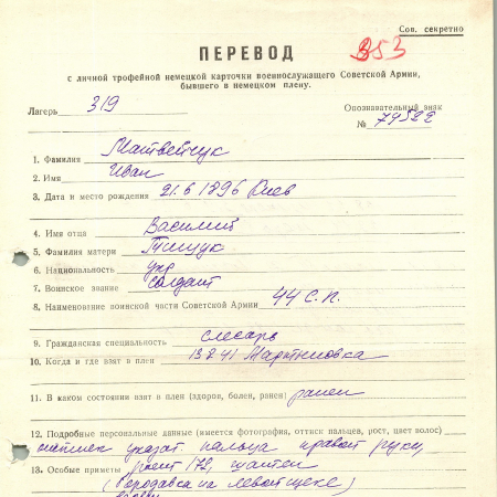 Матвейчук Иван Васильевич, 21.06.1896 г. р., Киев. Рядовой, 44 стрелковый полк. Попал в плен 13.08.1941 г. в Мартыновке. 12.11.1944 г. – рабочая команда 1483 Линтер.