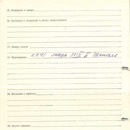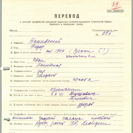 Нанивский Федор Иванович, октябрь 1907 г. р., с. Русаки, Иванковский район, Киевская область. Рядовой, пехота. Попал в плен 04.07.1941 г. в с. Трохович. 11.11.1941 г. – лагерь ХVIII В Шпигаль.