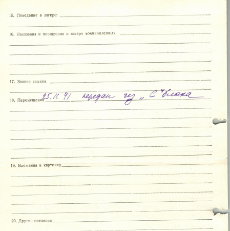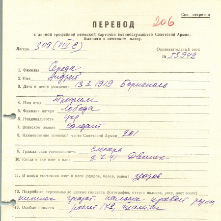 Середа Андрей Трофимович, 13.03.1919 г. р., Борисполь. Рядовой, 201. Попал в плен 08.07.1941 г. Двинеке. 25.11.1941 г. – передан из С-блока.