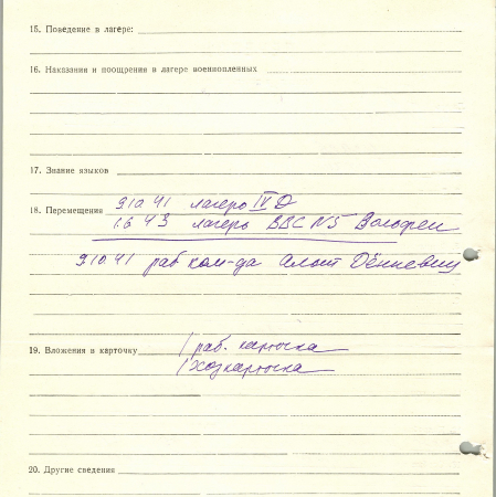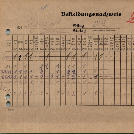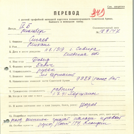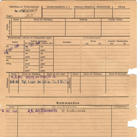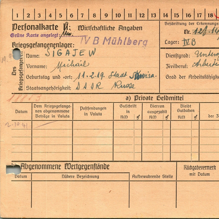 Сигаев Михаил Давидович, 11.02.1919 г. р., г. Сквира, Киевская область. Младший сержант, 9928 танковый батальон. Попал в плен 01.07.1941 г. в с. Хорщаны. 09.10.1941 г. – рабочая команда Альт Денневиц.