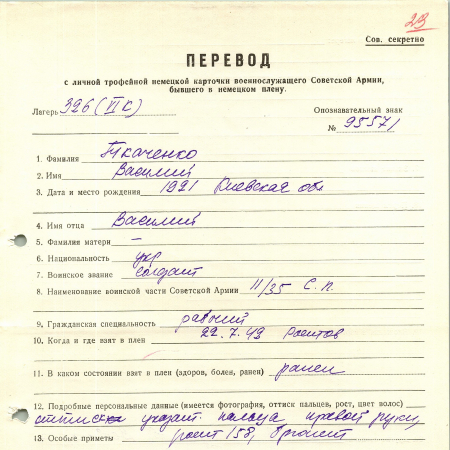 Ткаченко Василий Васильевич, 1921 г. р. Киевская область. Рядовой, 11/35 стрелковый полк. Попал в плен 22.07.1942 г. в Ростове. 13.04.1943 г. – передан в Веймар-Бухенвальд.
