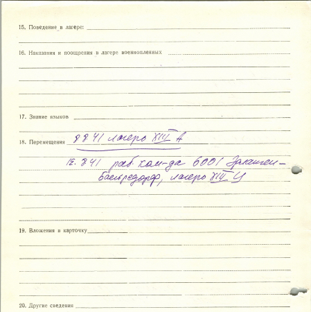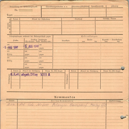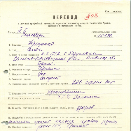 Троценко Семен Тарасович, 02.02.1917 г. р., с. Безугляки, Велико-Половецкий район, Киевская область. Рядовой, 200 строительный батальон. Попал в плен 04.07.1941 г. в Волынске. 19.08.1941 г. – рабочая команда 6001 Эрланген Баейредорф, лагерь ХIII С.