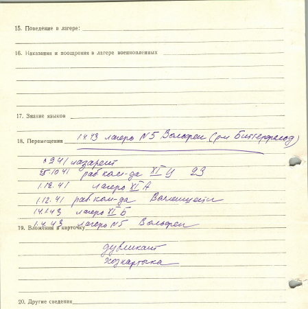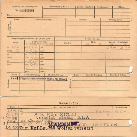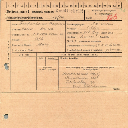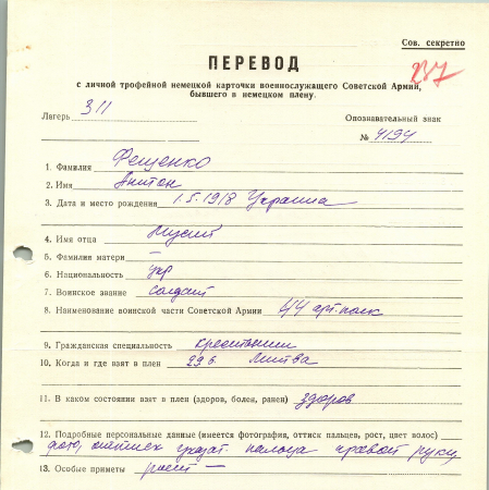 Фещенко Антон Мусиевич, 01.05.1918 г. р., Украина. Рядовой, 44 артиллерийский полк. Попал в плен 29 июня в Литве. 01.04.1943 г. – лагерь №5 Вольфен.