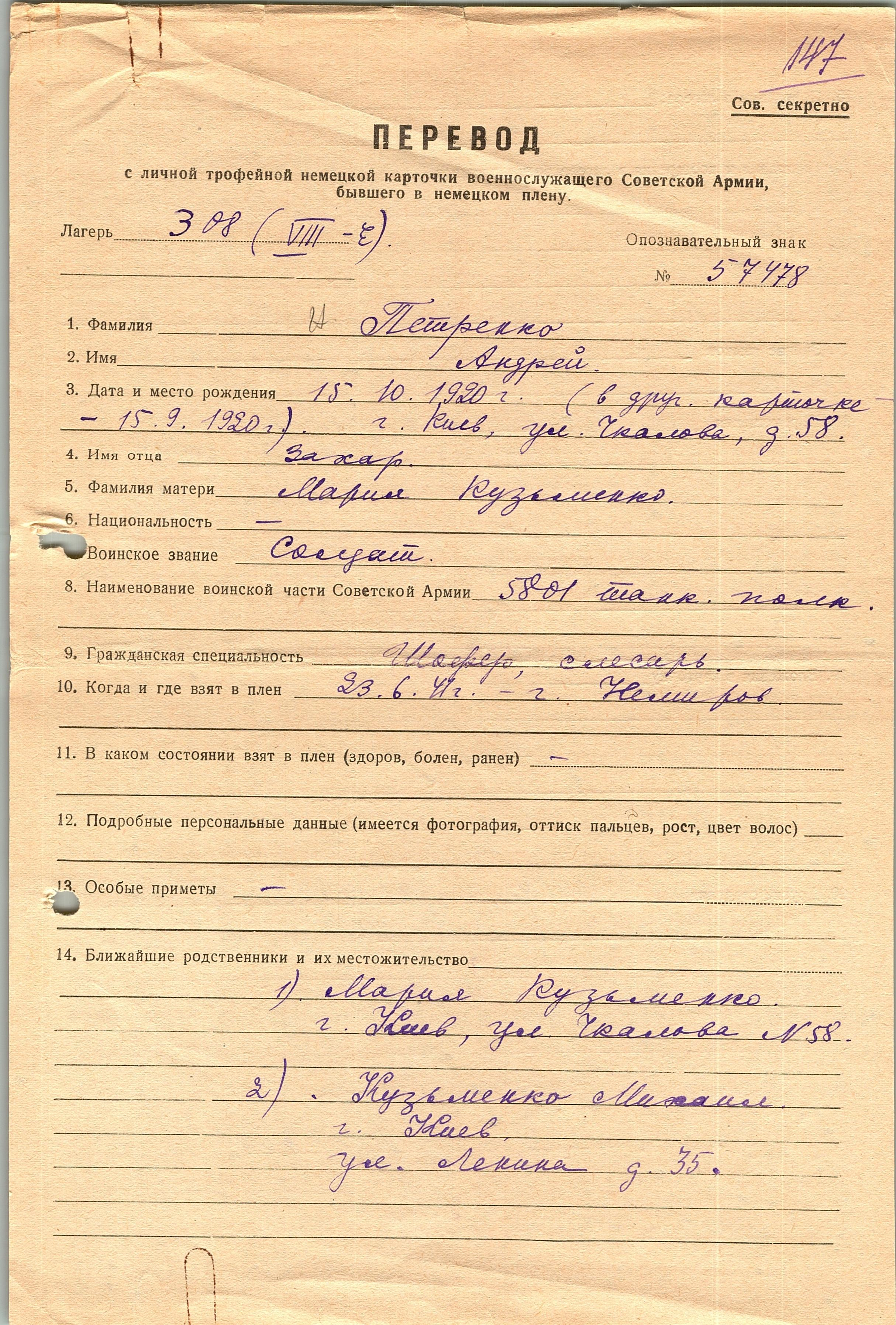 Военнопленные, трофейные карточки. Киевская обл.