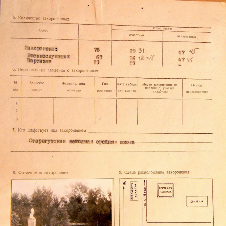 Всего захоронено 63 военнослужащих РККА и 13 партизан, известно 31 имя.