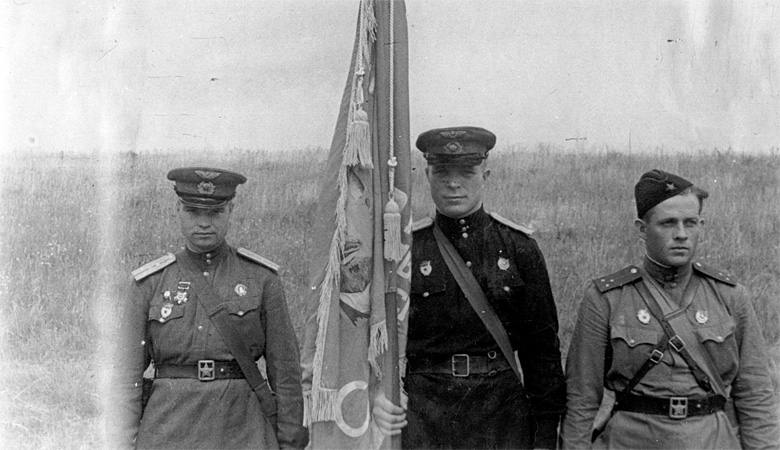 Знаменосец 10 Гв. авиаполка дальнего действия. Ассистенты: летчик Николай Краснов (слева), штурман Владимир Борисов (справа).