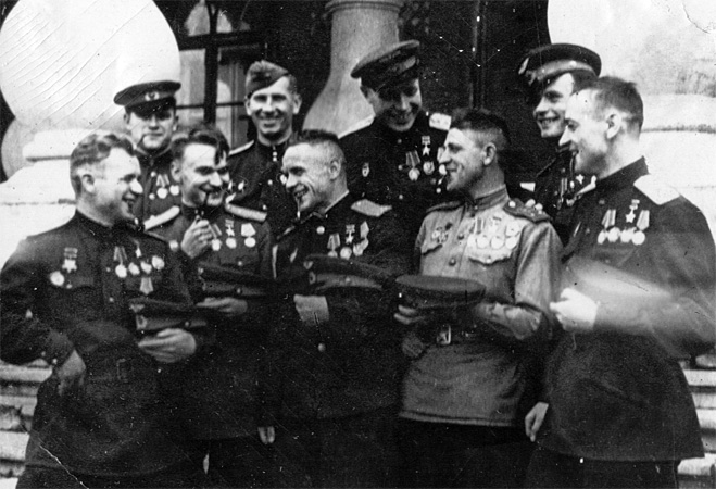 Группа летчиков и штурманов, Герои Советского Союза. Даценко в верхнем ряду второй справа, Безобразов с трубкой.